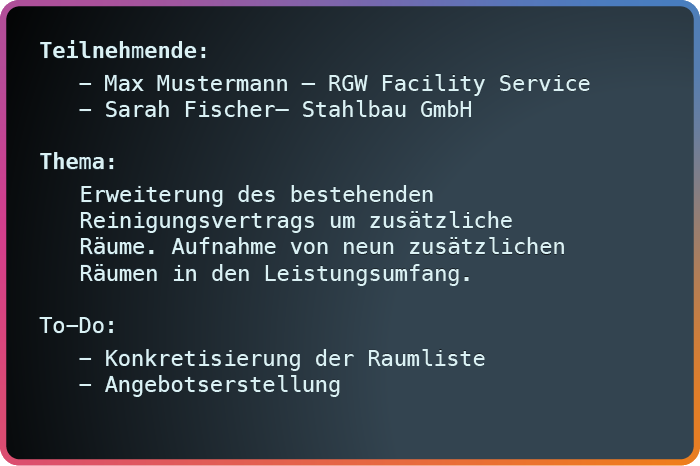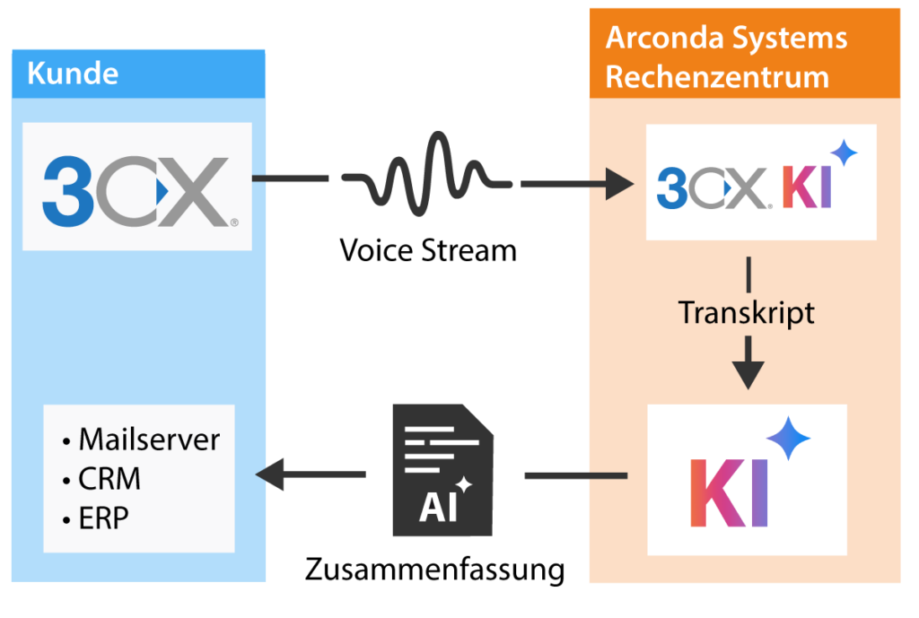 3CX erfasst beide Seiten eines Telefonats auf separaten Spuren und ordnet das Gesagte zuverlässig zu (Diarisierung). Die Audiospuren werden anschließend auf unserem eigens betriebenen 3CX Transcription Engine Server transkribiert und protokolliert. Mithilfe künstlicher Intelligenz wird das Gespräch zusammengefasst, und die wichtigsten Punkte werden klar aufgelistet. Dabei kommt unsere KI Arconda Intelligence zum Einsatz. Im Gegensatz zu vielen anderen Anbietern verbleiben alle Daten bei uns und werden nicht in die USA übertragen.